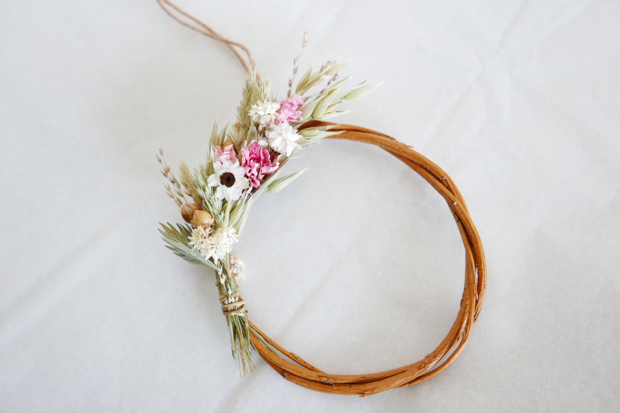 Kleiner Kranz aus Weidenruten mit Trockenblumen.