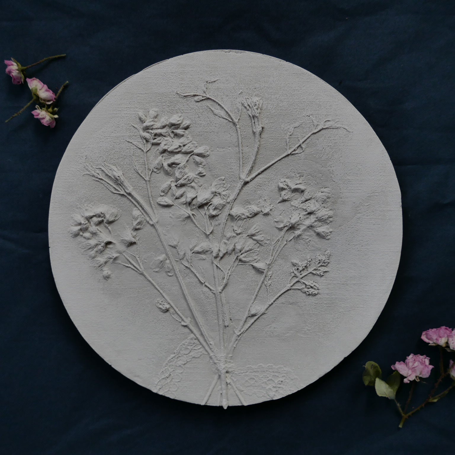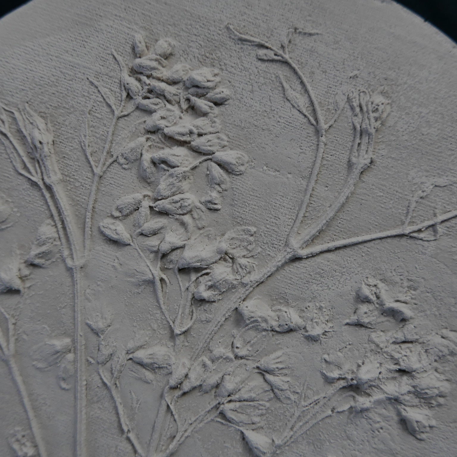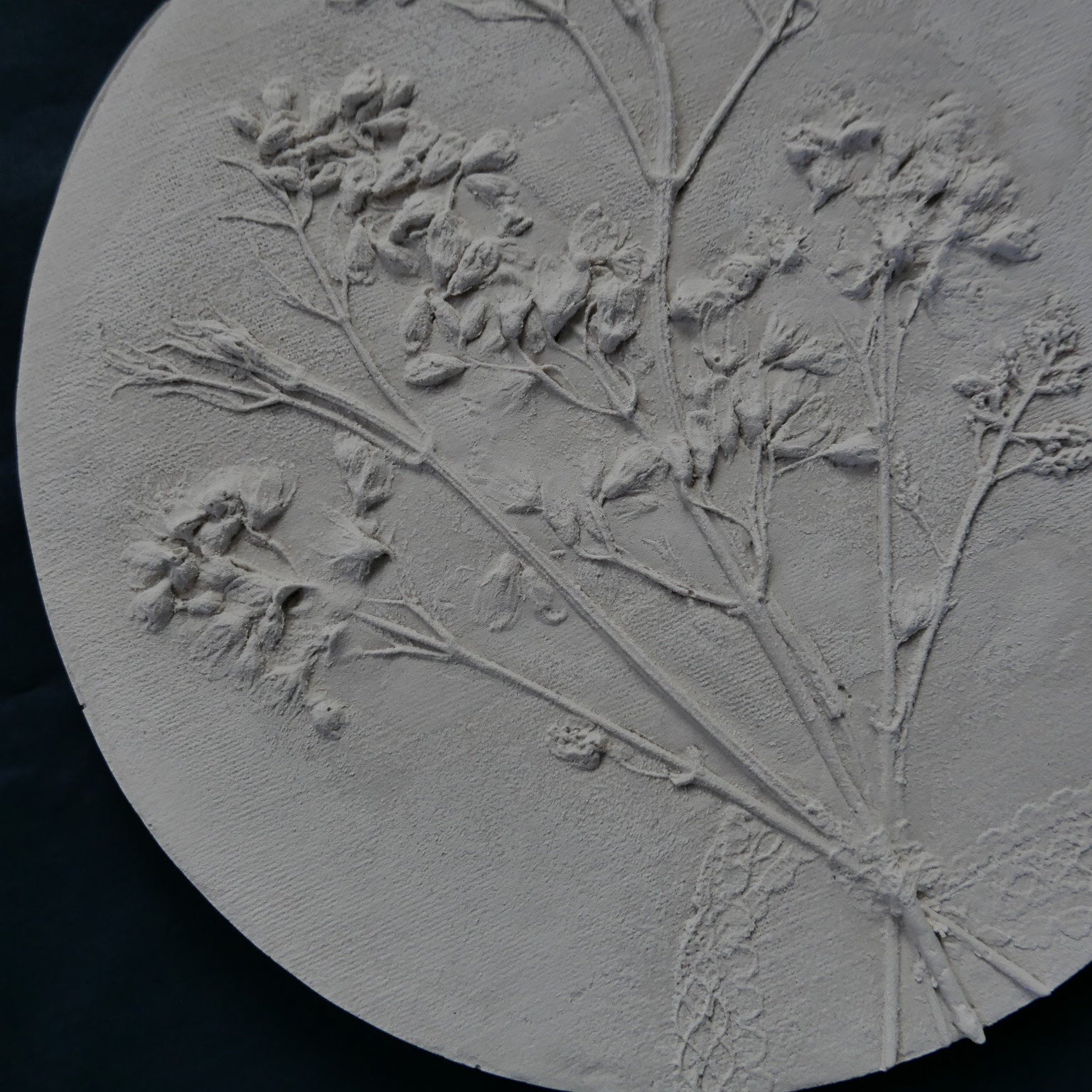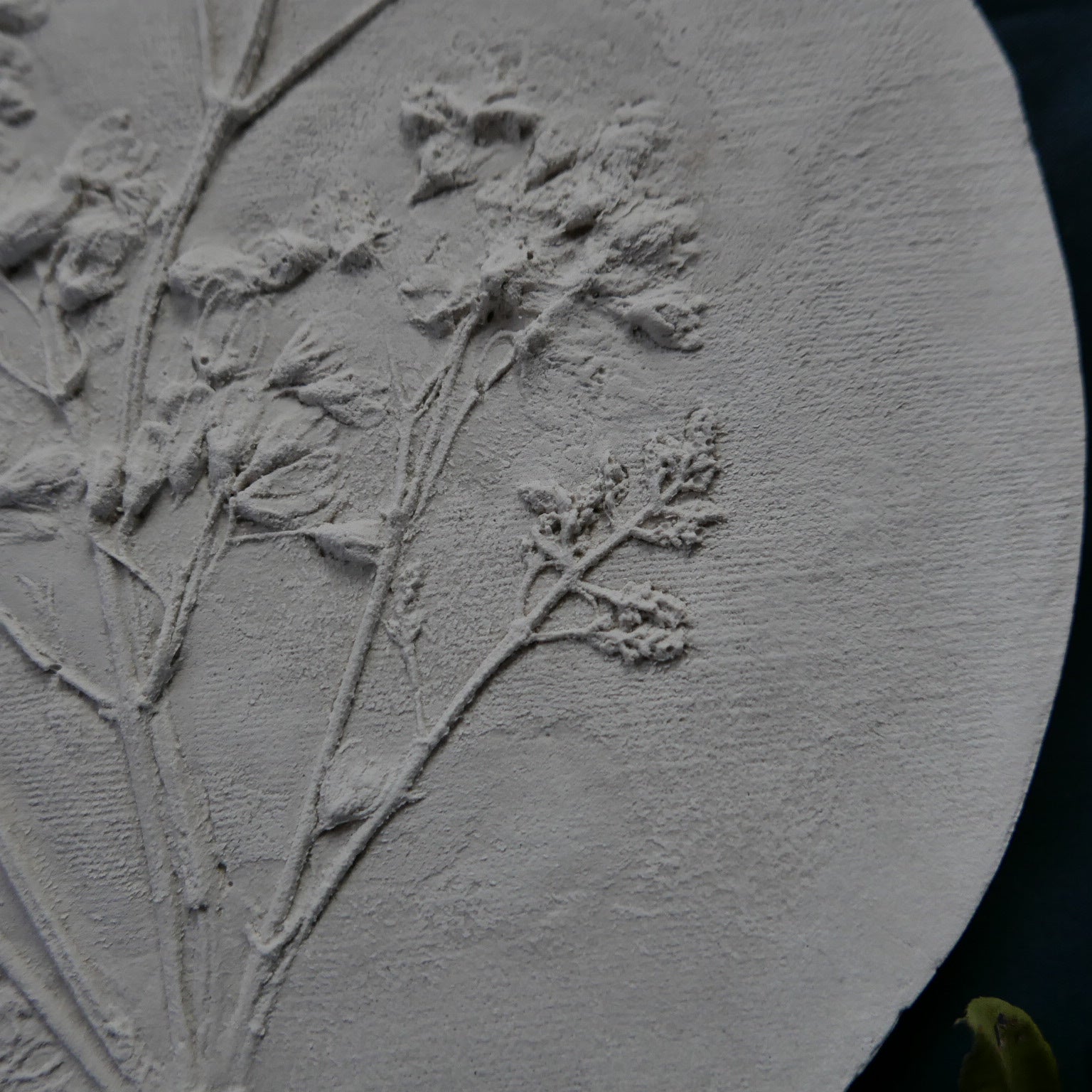 Botanical bas relief of deutzia and clematis in pure white. The relief can be hung using a holder on the back. Single piece.