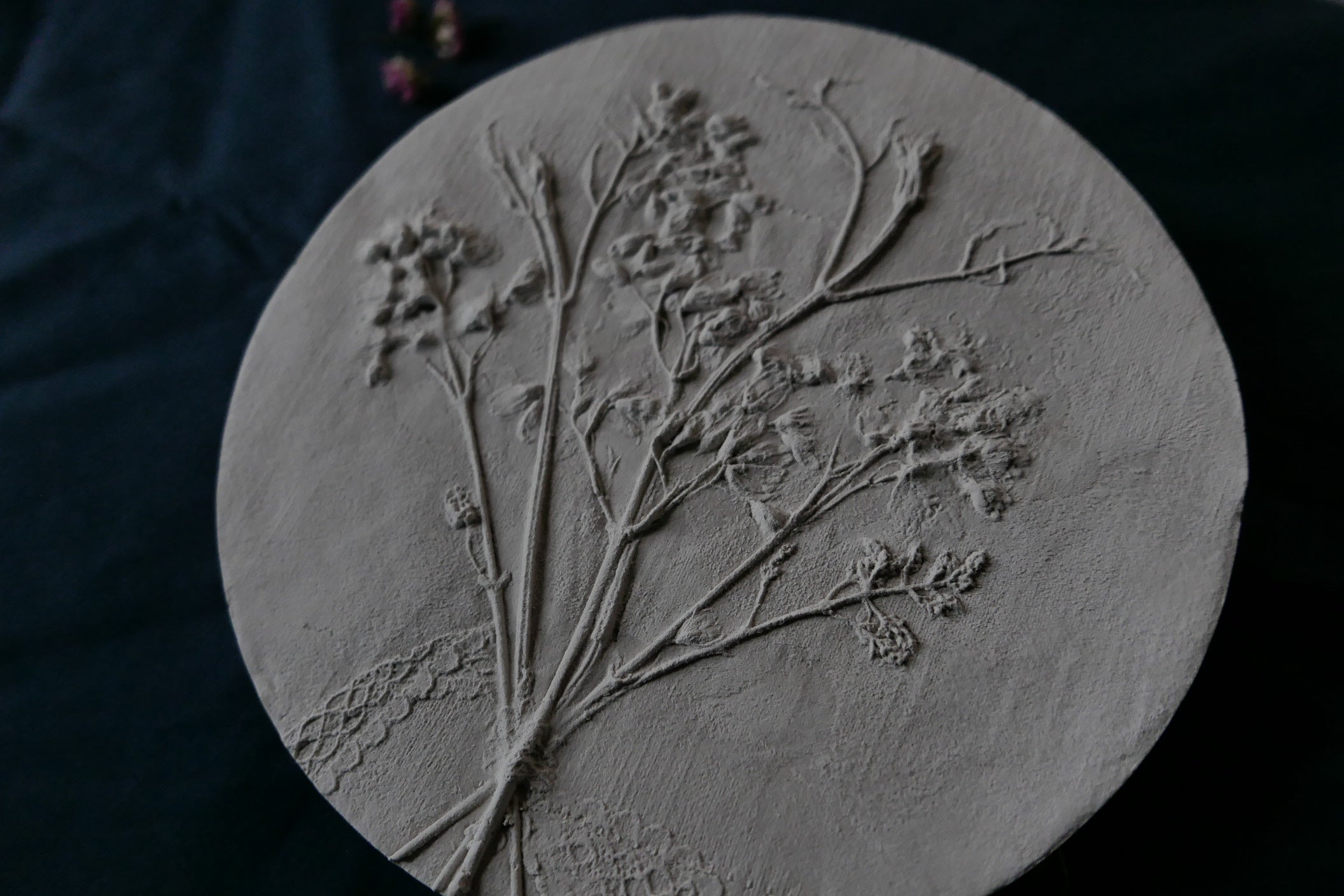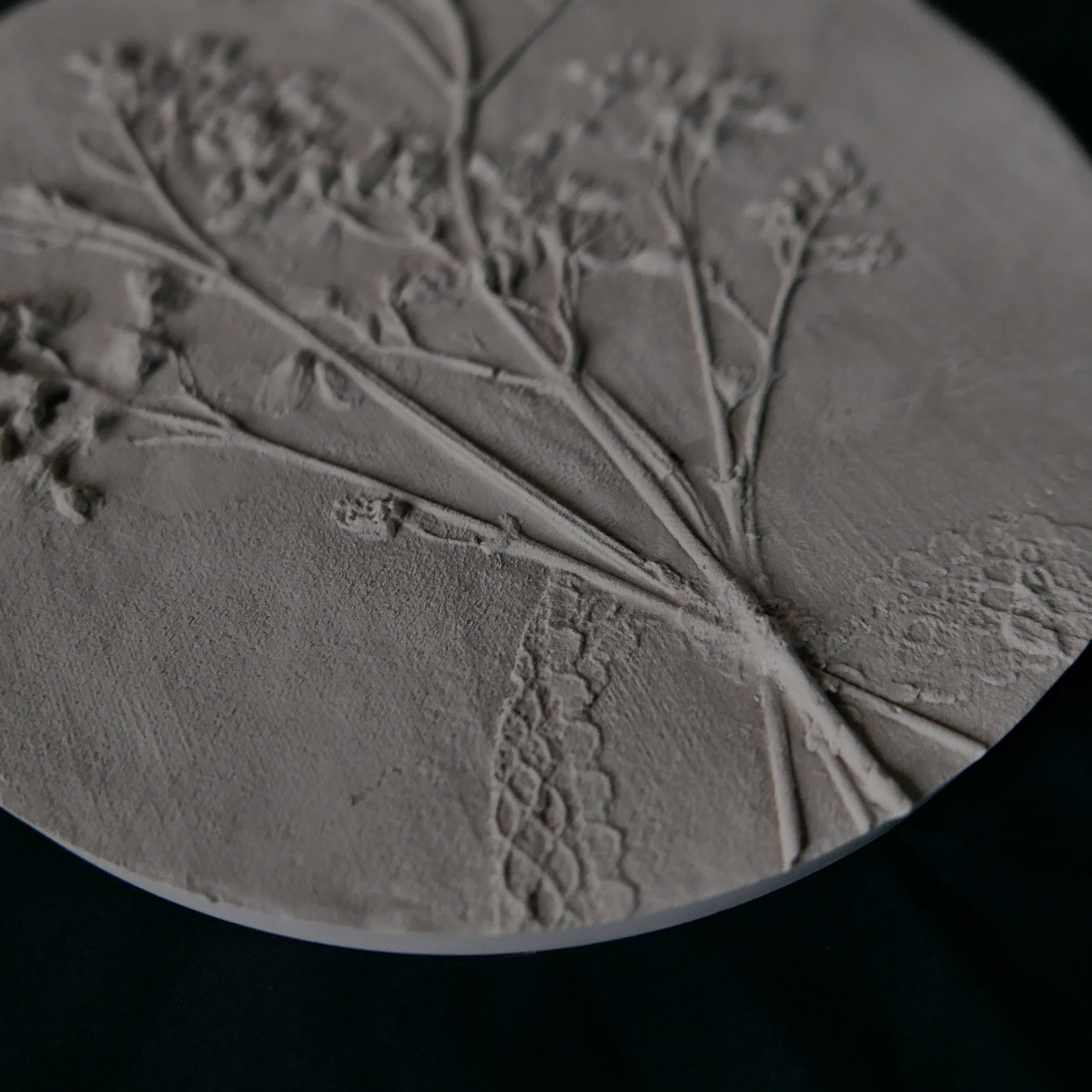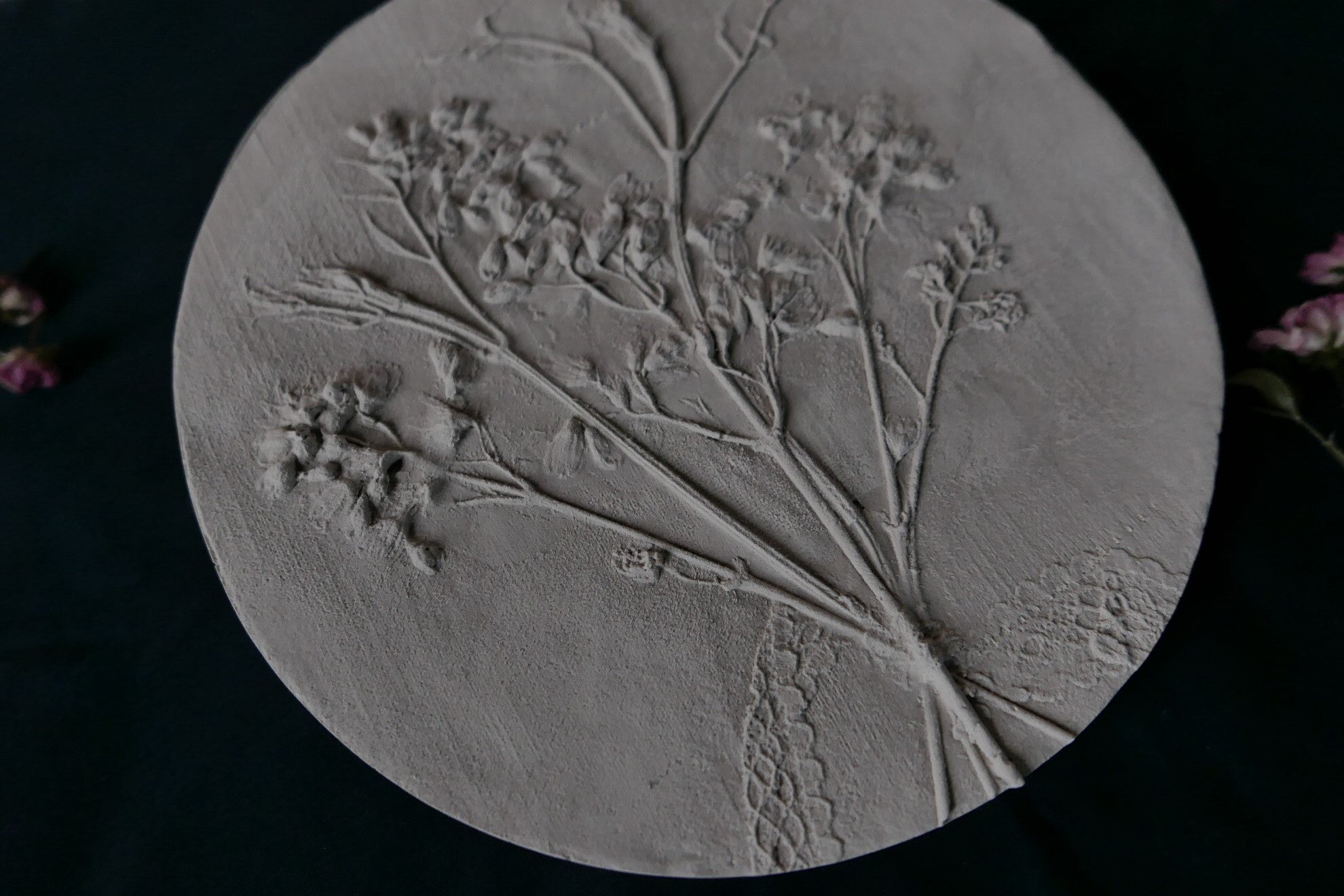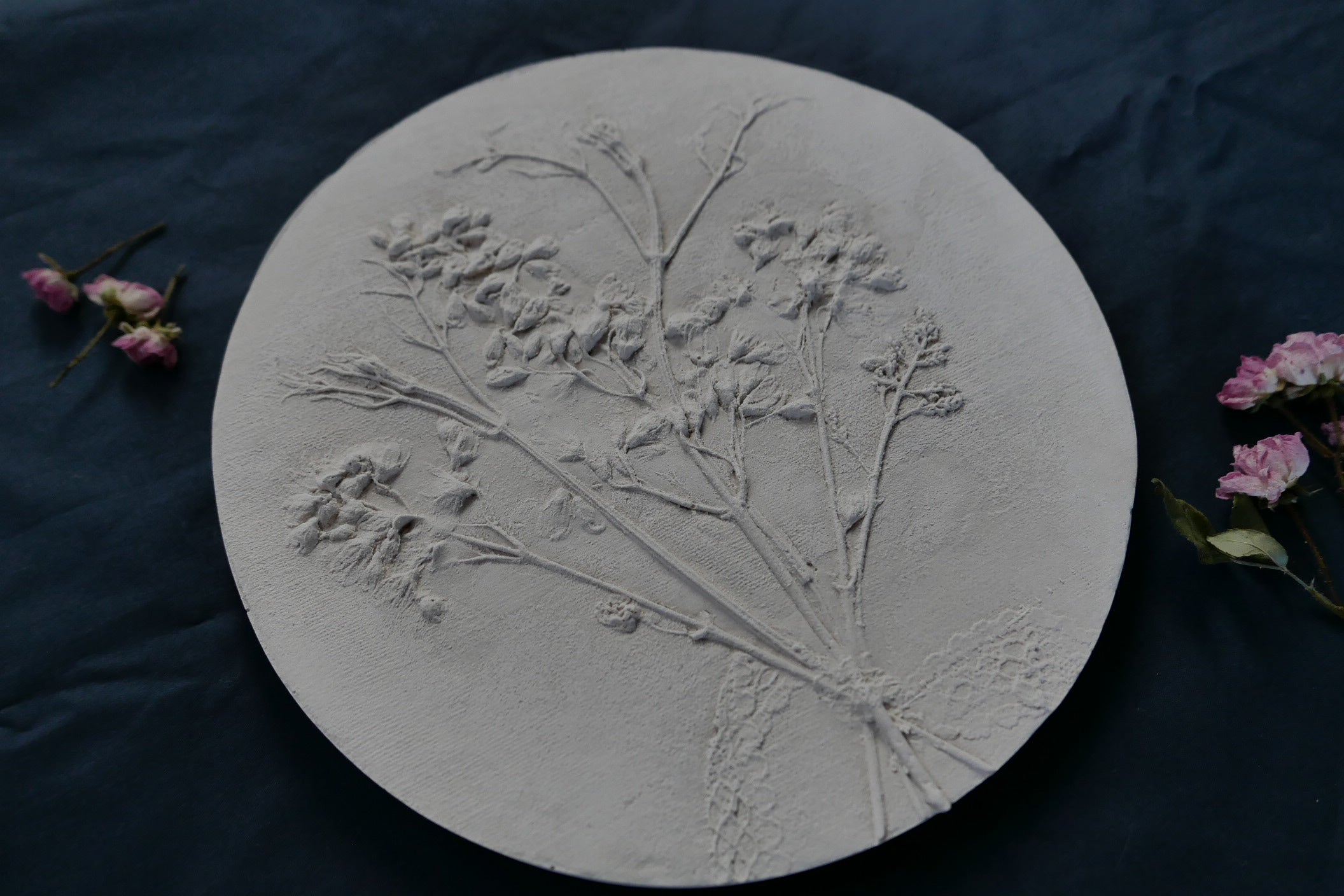 Botanical bas relief of deutzia and clematis in pure white. The relief can be hung using a holder on the back. Single piece.