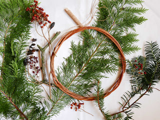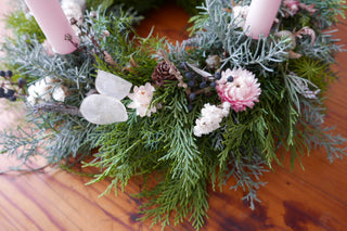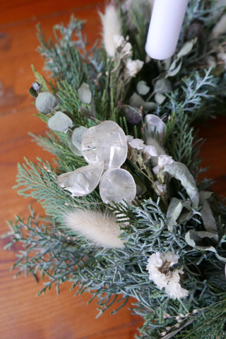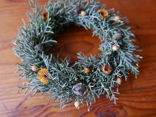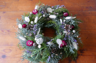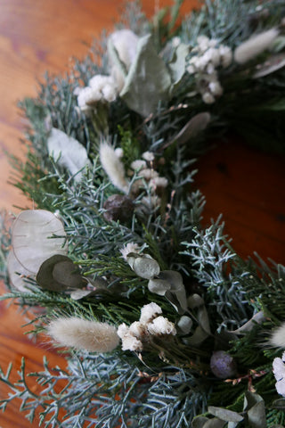 Christmas wreaths made from fresh winter greens and dried flowers, which were grown organically here in Germany. They also contain a small amount of plant material that is not certified organic but has grown in Germany in a nature-friendly way.